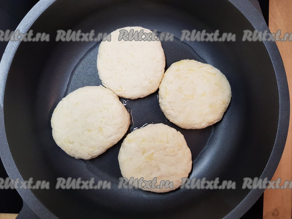 В сковороду налить подсолнечное масло, нагреть сковороду на сильном огне, затем выложить лепёшки.