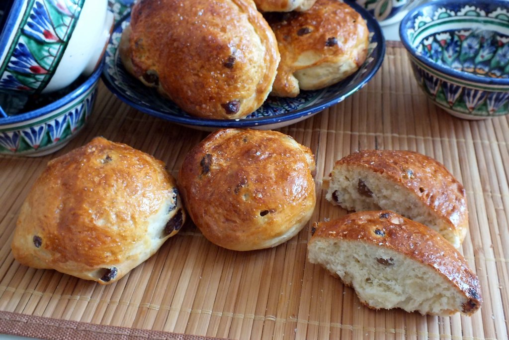 Приготовление булочек начните с подготовки изюма, тщательно промойте его и залейте кипятком на 10 минут, после воду слейте и оставьте просушиться.