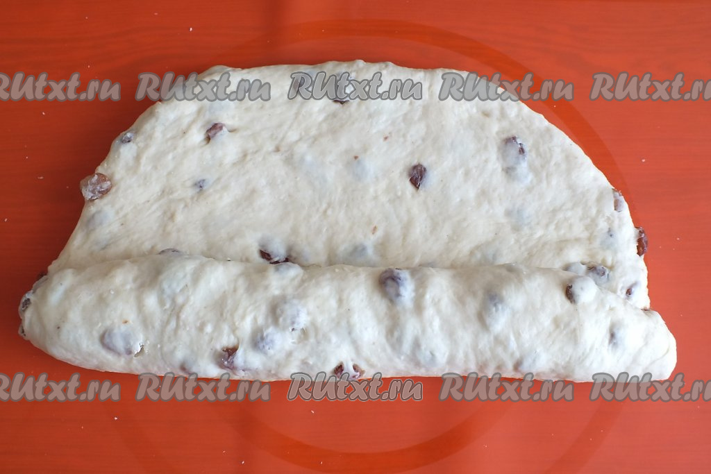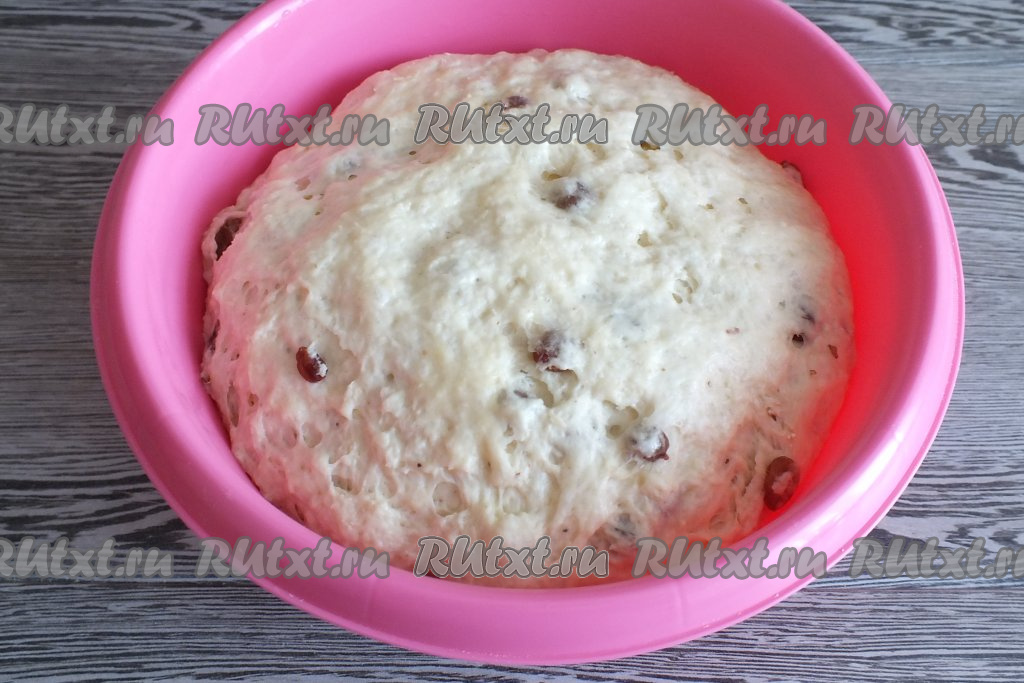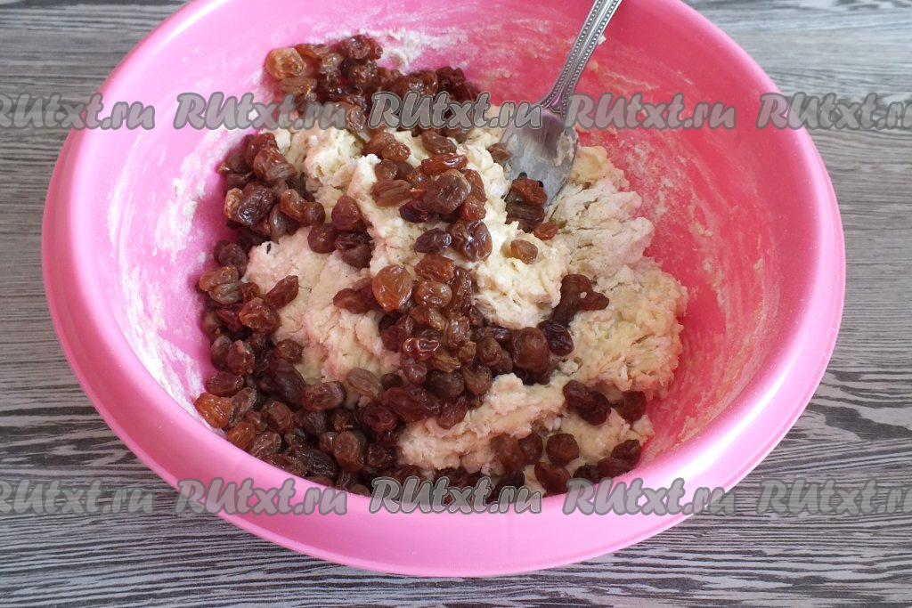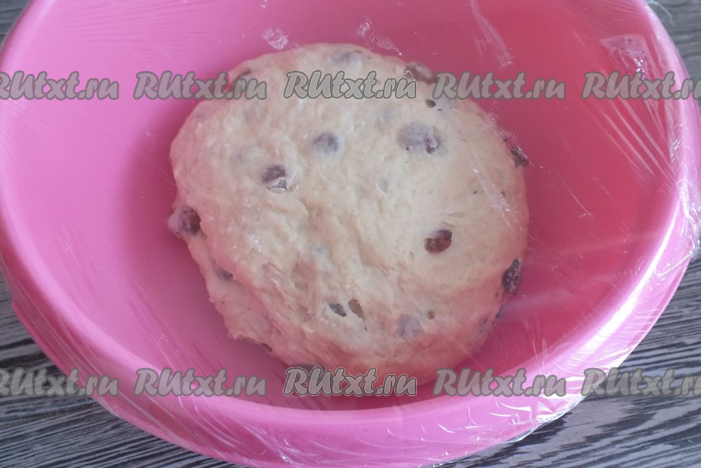 Добавьте изюм и далее замешивайте тесто руками. Тесто получается липнущим, поэтому обсыпьте руки 1-2 столовыми ложками муки - так удобнее собрать тесто в комок.