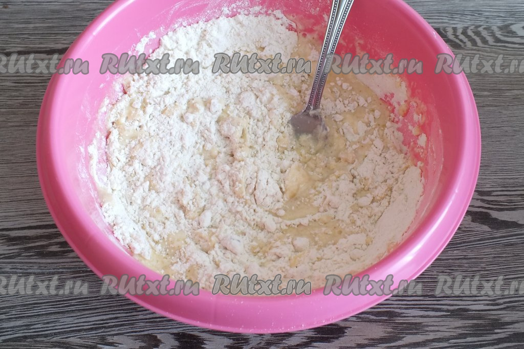 В миску с мукой и дрожжами влейте тёплую яично-молочную смесь, смешанную с яйцом, перемешайте вилкой.