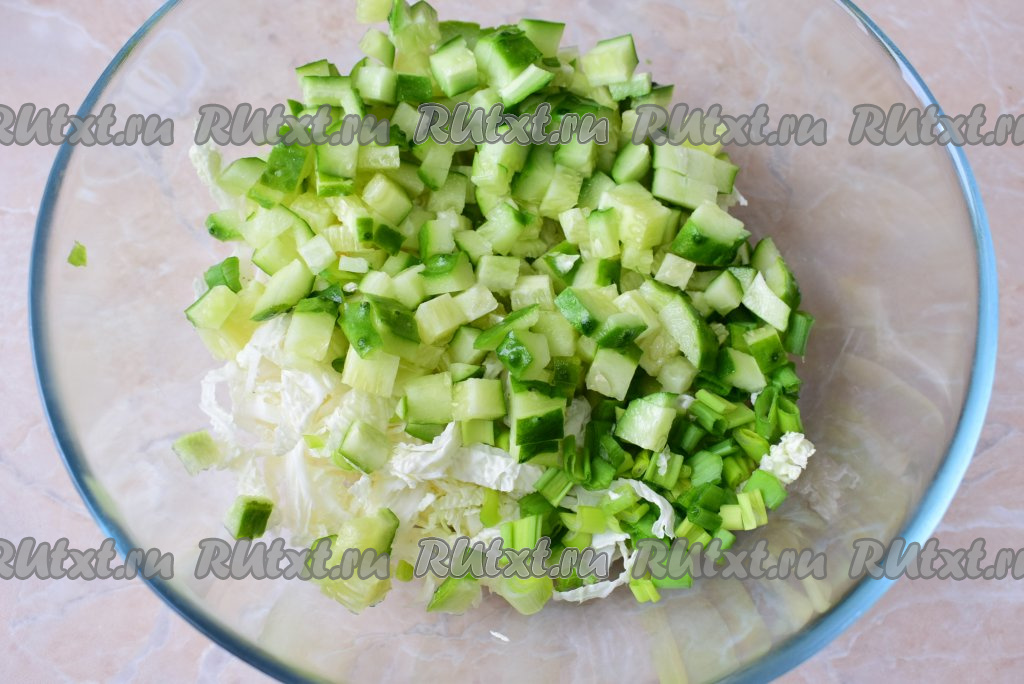 Вымытый свежий огурец нарежьте кубиками, добавьте его к пекинской капусте и луку.