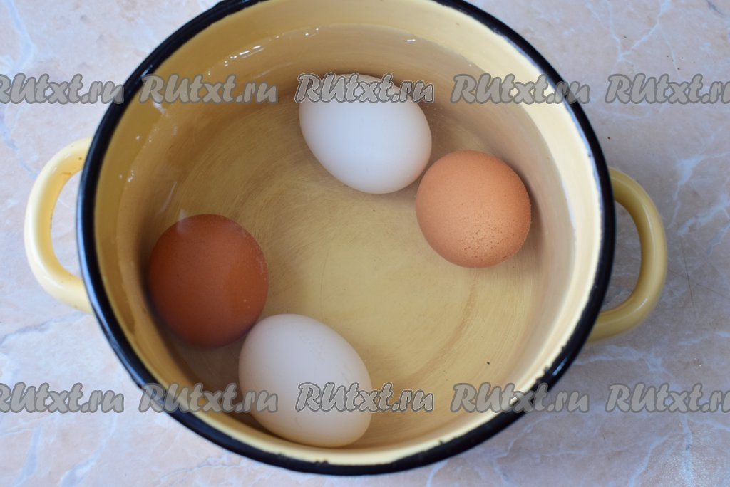 Прежде всего отварите в кипящей воде яйца в течение минут 7-8, затем горячую воду слейте. Залейте яйца холодной водой и оставьте до полного остывания.