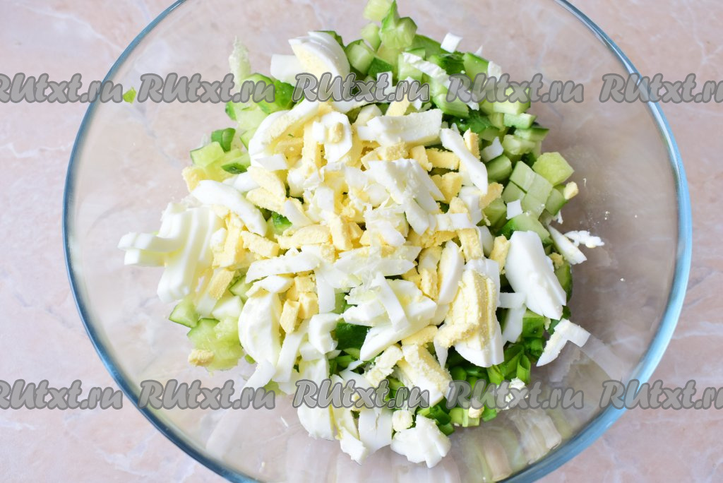 Остывшие варёные яйца очистите от скорлупы, нарежьте и добавьте в салат.