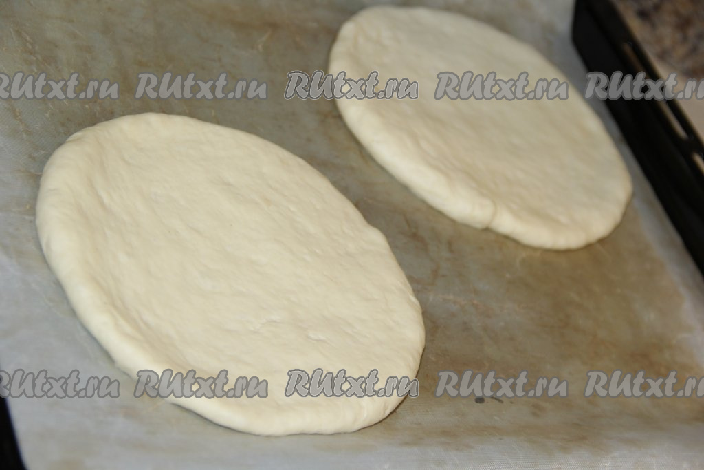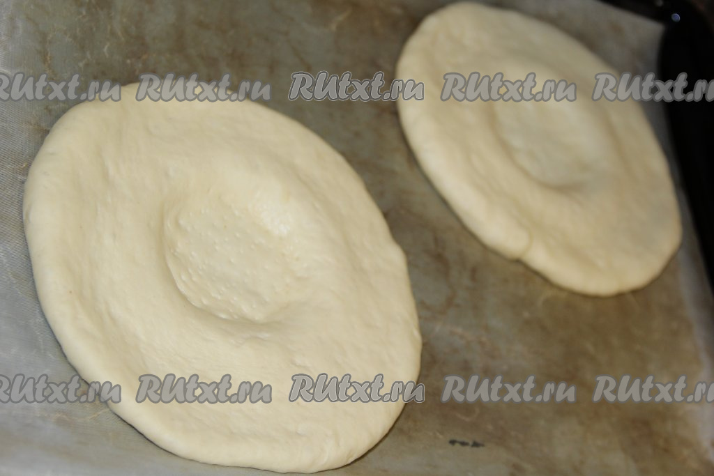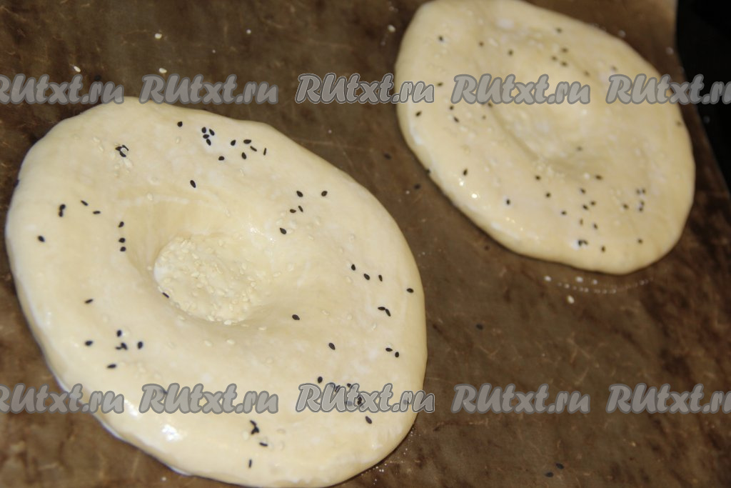 Раскатать каждую часть теста в круглую лепёшку толщиной, примерно, 1 см. Выложить узбекские лепёшки на противень, застеленный пергаментом.