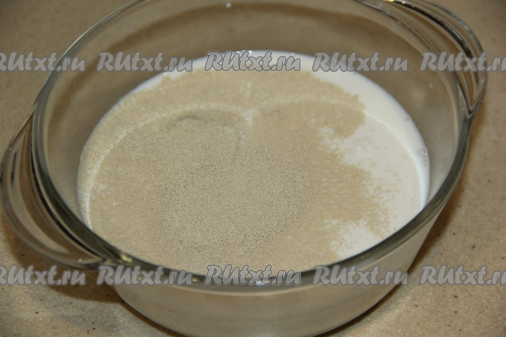 Первым делом сделаем опару, для этого в молоко, подогретое до 40 градусов (в более горячем молоке дрожжи могут погибнуть), нужно всыпать сухие дрожжи и сахар, перемешать и оставить на 15 минут.