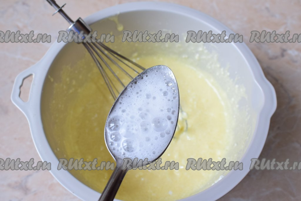 Соду погасите уксусом (она начнёт пениться), добавьте её в миску к творожно-яичной массе, перемешайте.
