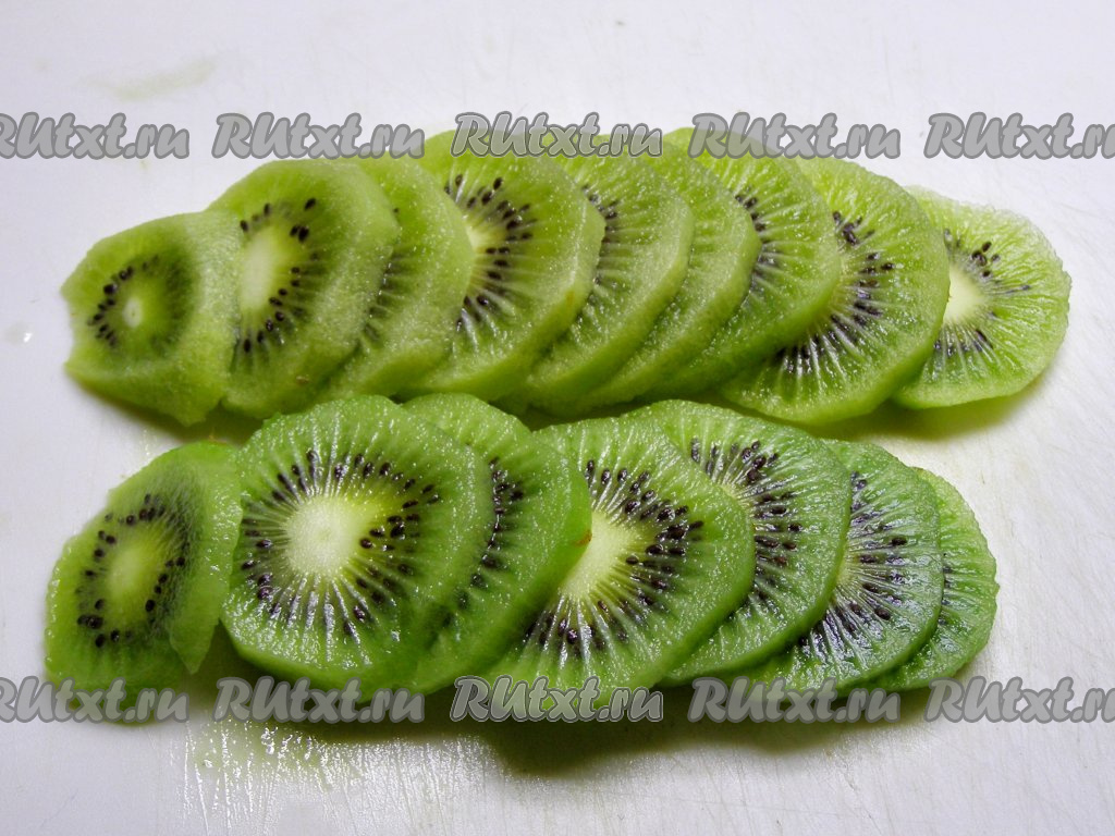 Подготовим фрукты и ягоды. Киви, очистив от кожицы, нарезаем на тонкие кружочки.