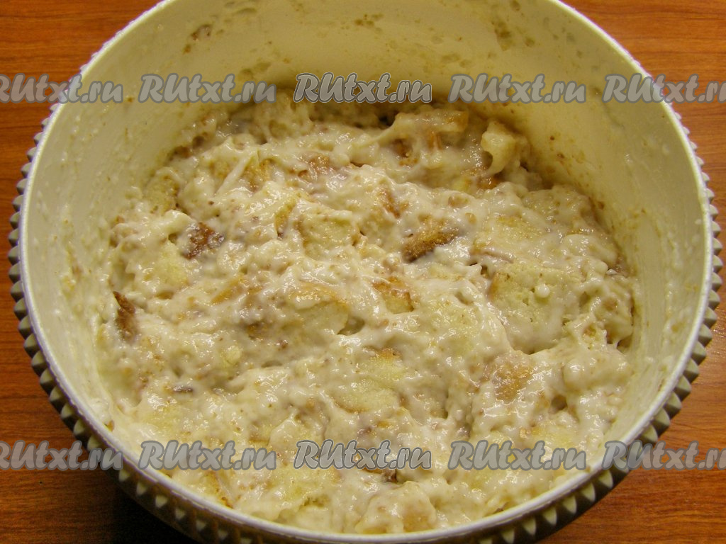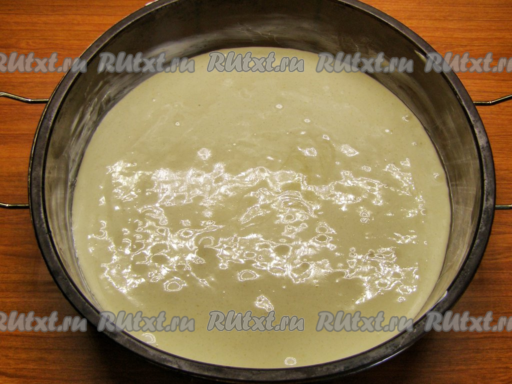 Форму для выпечки смазываем небольшим кусочком сливочного масла (или маргарина) и выливаем в неё приготовленное тесто.