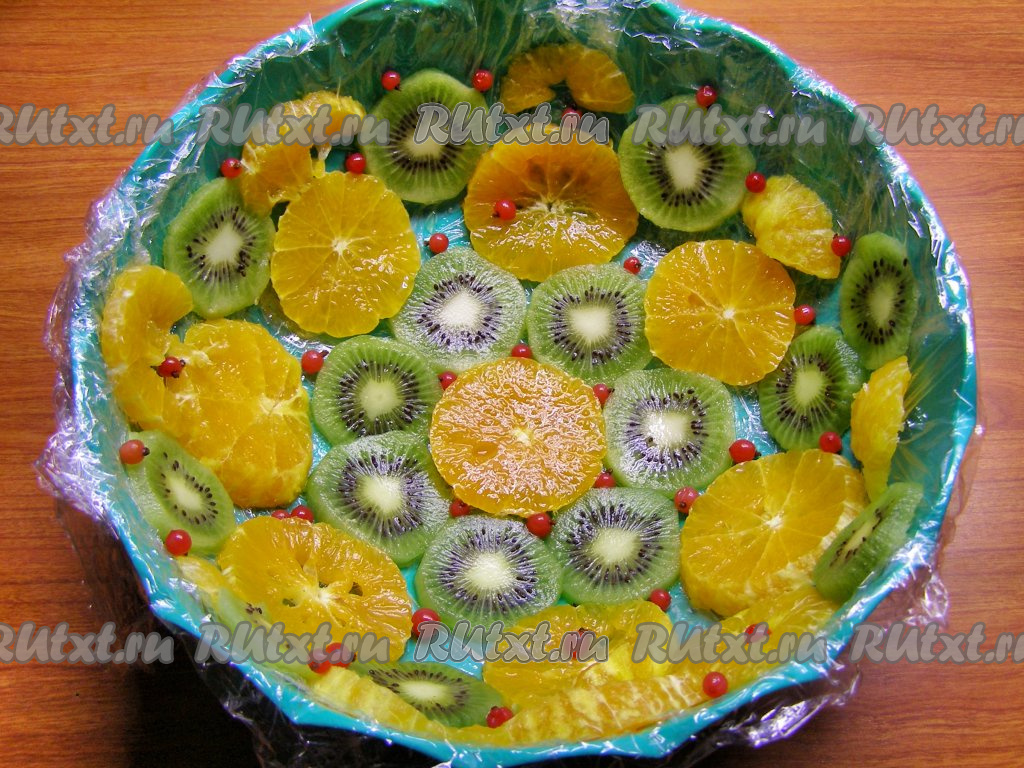 Форму для торта (диаметр формы, примерно, 20 см, глубина - 7-9 см) застилаем пищевой плёнкой, концы плёнки должны свисать с краёв формы. Выкладываем в застеленную форму кружочки фруктов и ягоды.