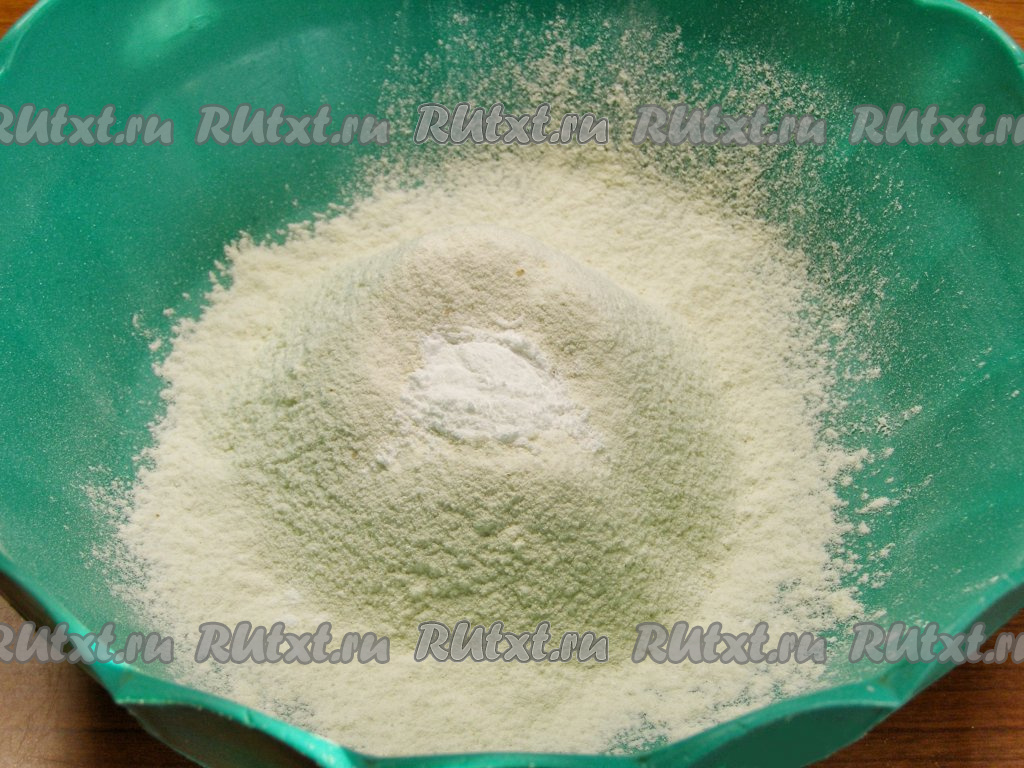 В отдельную миску просеиваем муку, добавляем в неё разрыхлитель теста, щепотку соли и ванильный сахар, перемешиваем.