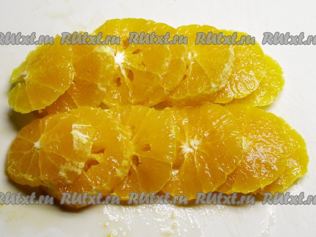 С мандаринов снимаем кожуру, удаляем белые прожилки и тоже нарезаем кружочками. Если попадаются косточки, их обязательно нужно удалить. Если вы используете другие фрукты, их тоже нужно очистить от кожицы и тонко нарезать. Если добавляете замороженные ягоды (например, смородину, малину, землянику), то их размораживать не надо, достаточно просто сполоснуть прохладной водой и слегка просушить на бумажном полотенце. Крупные ягоды замороженной клубники надо разморозить совсем немного, чтобы можно было нарезать, но чтобы ягодки не потекли и не потеряли форму.