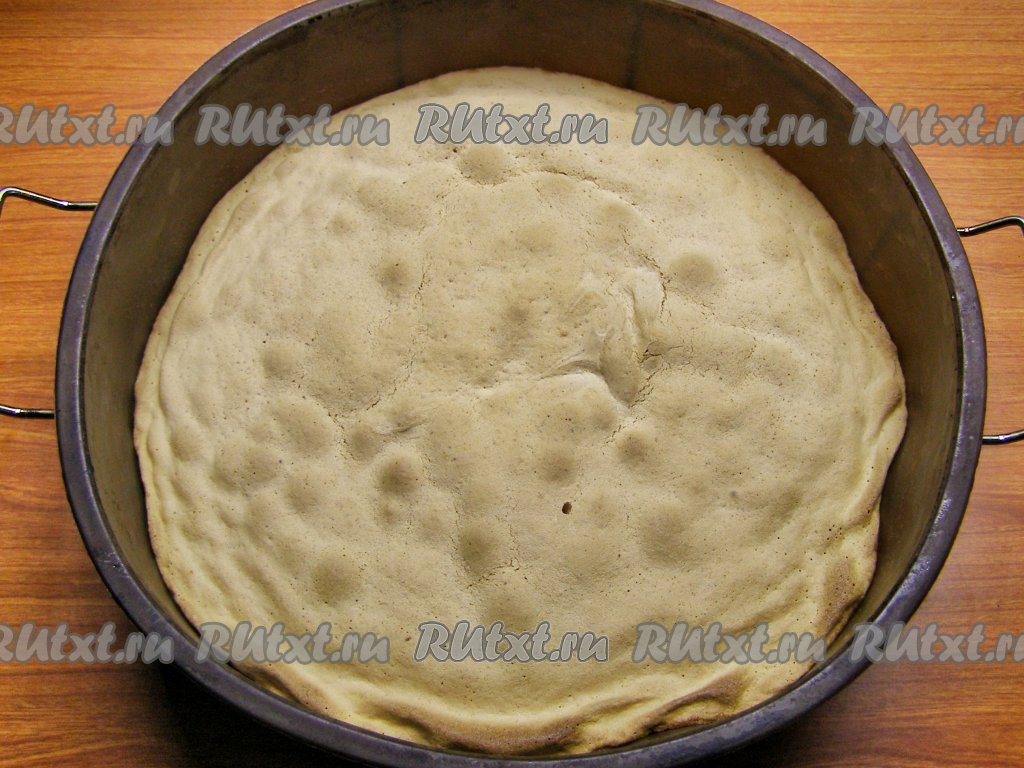 Духовку прогреваем до 180 градусов и выпекаем бисквит около 20 минут. Готовность бисквита можно проверить с помощью деревянной шпажки (шпажка останется сухой при прокалывании полностью готового бисквита). Готовый бисквит, достав из духовки, вынимаем из формы и даём полностью остыть.