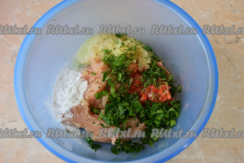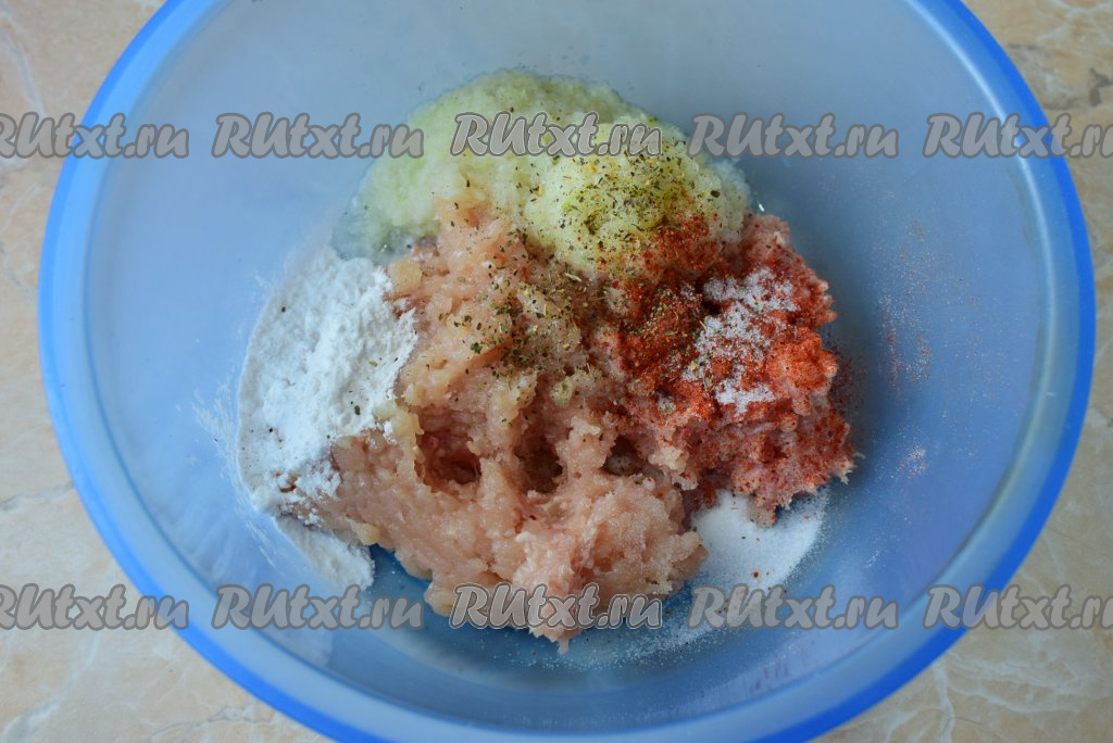 Соедините куриный фарш и измельчённый лук в достаточно глубокой миске, добавьте специи и соль по вкусу, всыпьте крахмал.