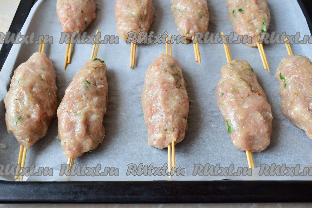 Деревянные шпажки замочите в воде на пару часов. Руки смажьте растительным маслом и сформируйте небольшие колбаски. В центр каждой колбаски вдавите шпажки. Выложите люля-кебабы из курицы на противень, застеленный пергаментом, и поставьте на 15 минут в духовку, разогретую до 200 градусов. Затем переверните каждый люля-кебаб, чтобы они запекались наиболее равномерно, и отправьте в духовку ещё минут на 15.