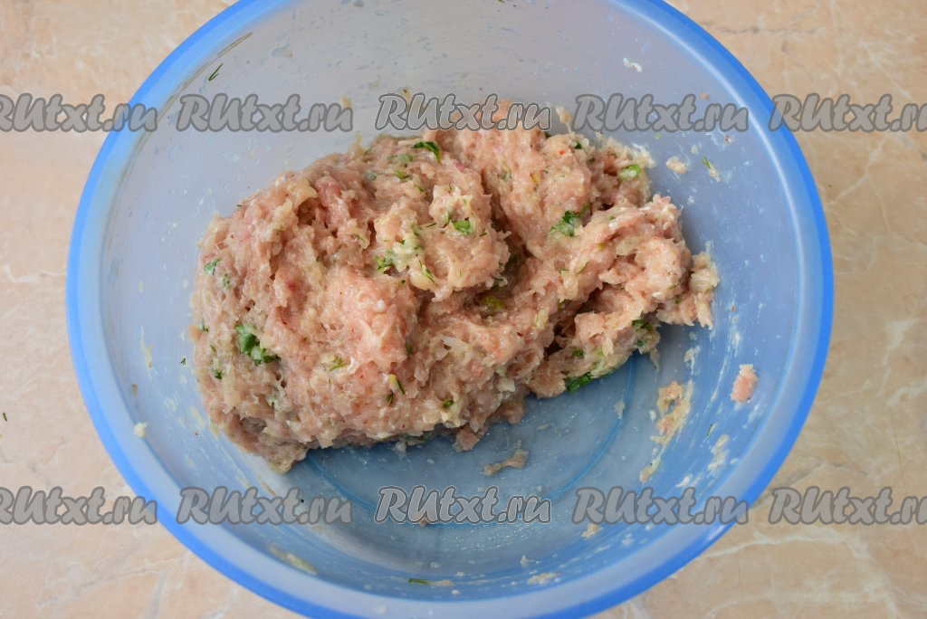 Тщательно перемешайте куриный фарш, он должен стать плотной, однородной массой. Для того чтобы фарш стал более плотным, хорошо отбейте его о дно миски (просто поднимайте фарш и бросайте с силой на дно миски).