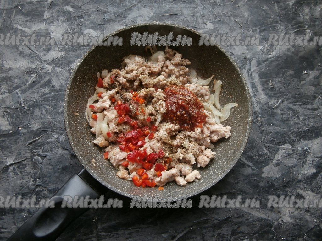 Обжарить фарш с луком в течение 4-5 минут, перемешивая, на среднем огне. Затем добавить соль, чёрный молотый перец, томатный соус, специи и мелко нарезанный перец чили.