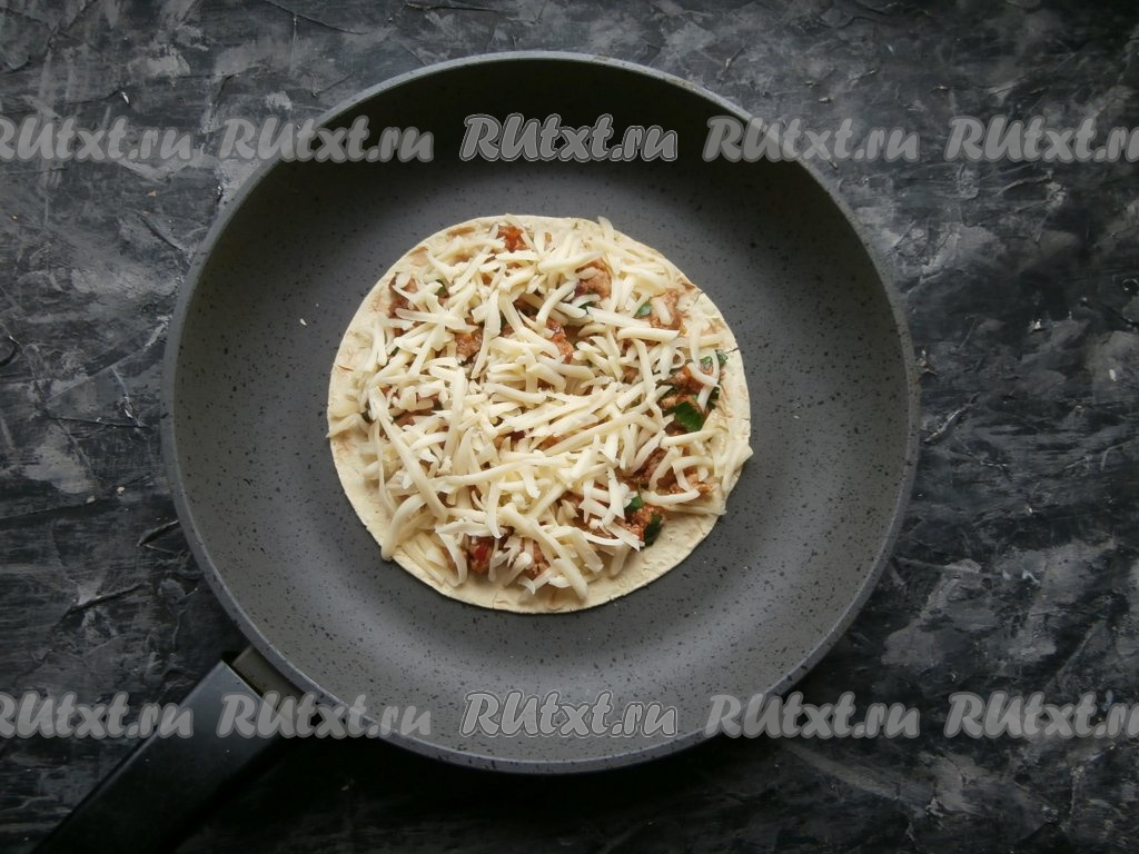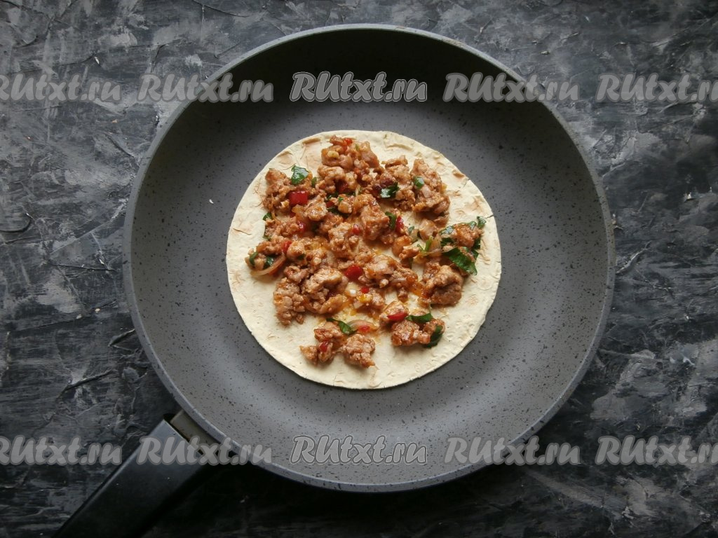 Выложить половину фарша (вторая половина пойдёт на вторую кесадилью), распределив его по всей лепёшке.