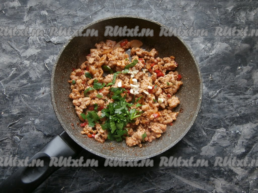 Перемешать и обжаривать на небольшом огне ещё минут 5. Затем добавить измельчённую зелень и мелко нарезанный чеснок. Фарш перемешать и выключить огонь.