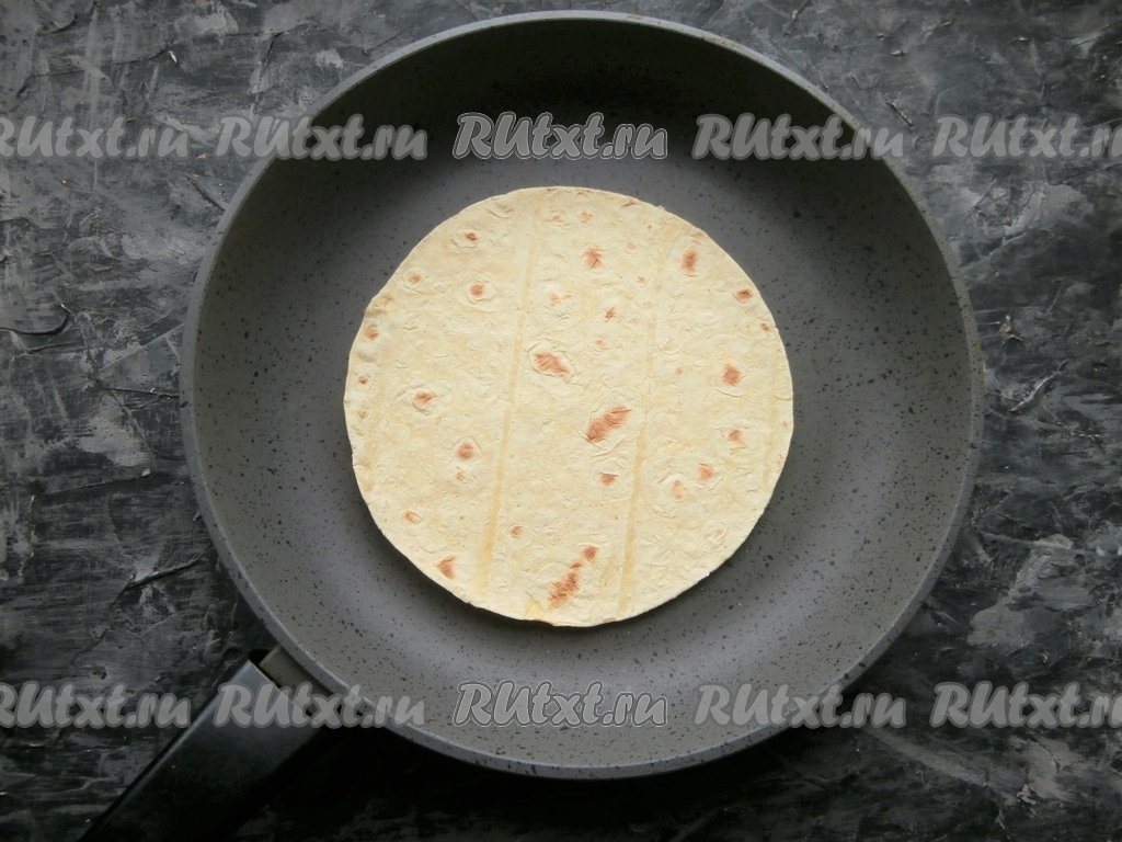 Накрыть второй лепёшкой, придавливая её к начинке. Через несколько секунд с помощью лопатки кесадилью перевернуть и подсушить вторую лепёшку в течение 2-3 минут. Аналогично приготовить вторую кесадилью.