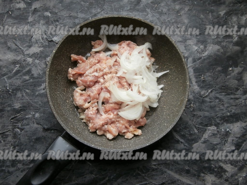 Фарш лучше всего использовать крупнорубленый, перекрученный на мясорубке с крупной решёткой. В сковороде разогреть оливковое масло, выложить мясной фарш и нарезанный тоненькими перьями очищенный репчатый лук.