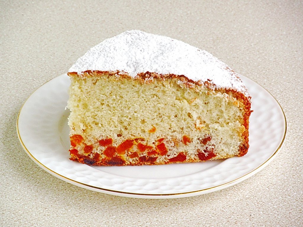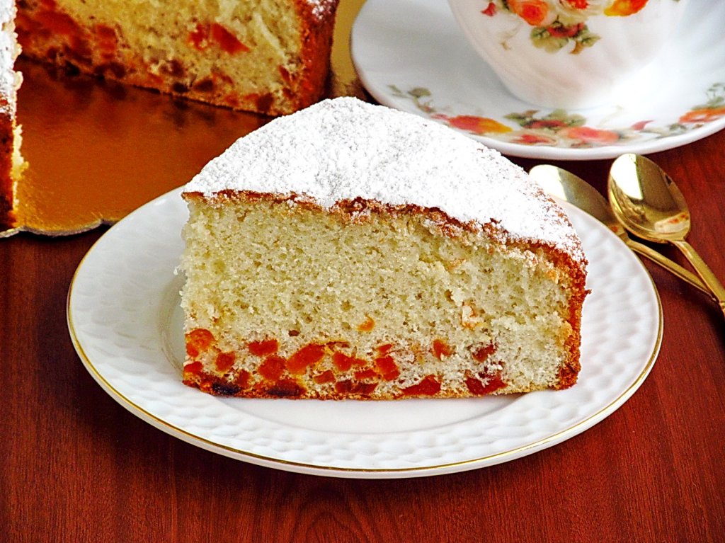 Пышный, очень вкусный бисквит с курагой нарезать и подать к столу с любимыми напитками.