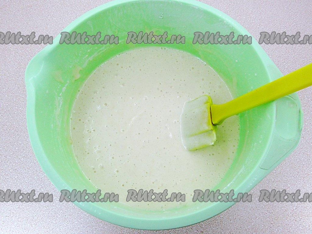 Муку с разрыхлителем с помощью лопаточки аккуратно вмешать в тесто, перекладывая тесто движениями снизу вверх. Бисквитное тесто должно получиться воздушным, напоминающим по консистенции сметану.