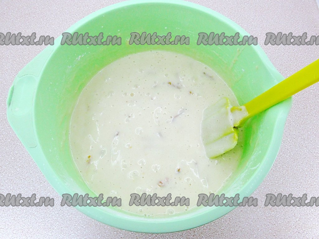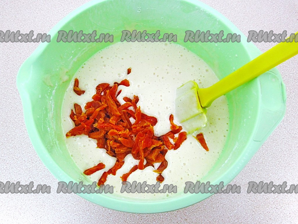 Снова очень осторожно перемешать лопаткой. Курага должна равномерно распределиться по всему объёму теста.