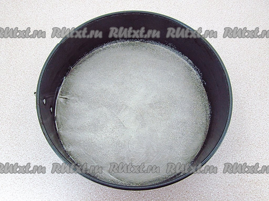 Взять разъёмную форму для выпечки (у меня форма диаметром 21 см), раскрыть её, снять боковую часть, а на дно формы положить лист бумаги для выпечки. Снова надеть боковую часть и, прижав бумагу, защёлкнуть форму. Дно формы смазать маслом и обсыпать мукой (или манкой). Стенки формы ничем смазывать не нужно.