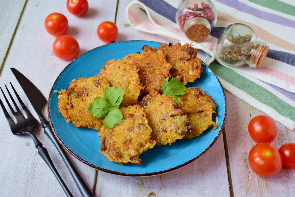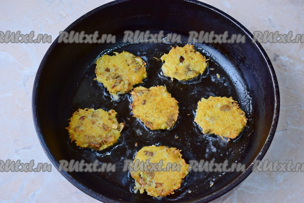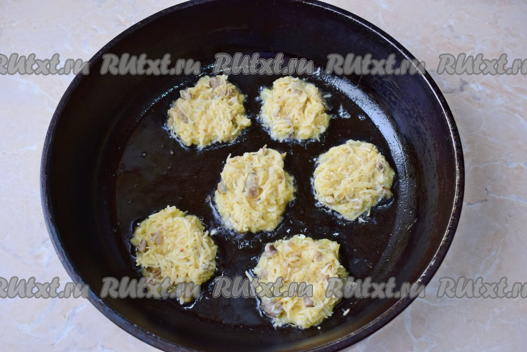 На горячую сковороду налейте немного растительного масла и выкладывайте столовой ложкой картофельную массу, формируя небольшие лепёшки.
