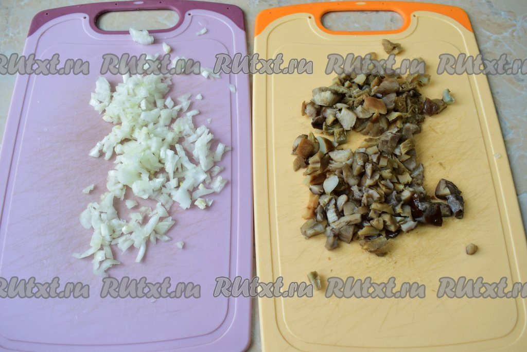 Если вы готовите драники с лесными грибами, тогда их нужно предварительно перебрать и отварить с момента закипания воды в течение минут 25-30, а после этого откинуть на дуршлаг и оставить в нём до тех пор, пока грибочки немного не обсохнут. Шампиньоны, вешенки отваривать не нужно, просто вымойте их. Если планируете готовить с консервированными грибами, слейте с них маринад. Подготовленные грибы мелко нарежьте. Лук очистите от шелухи, ополосните в воде и тоже мелко нарежьте. Чем мельче будут нарезаны лук с грибами, тем более однородными получатся драники.