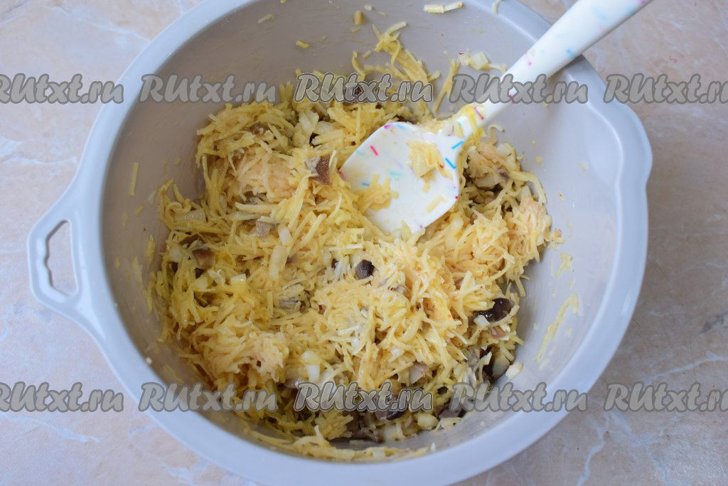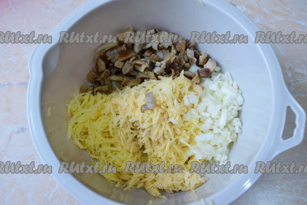 К натёртому картофелю добавьте подготовленные грибы и лук.