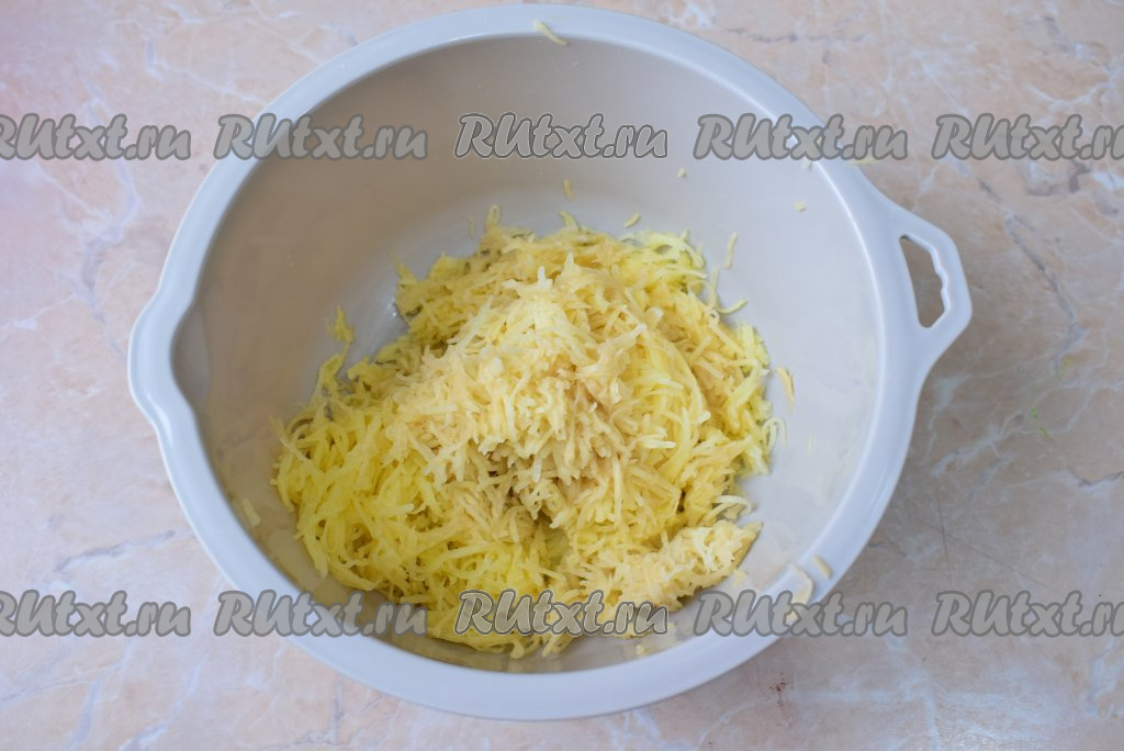 Картофель натрите на средней тёрке и отожмите лишний сок (выделившийся сок нам не понадобится).