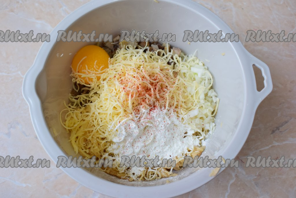 В получившуюся массу натрите на мелкой тёрке сыр, добавьте яйцо, 1 столовую ложку крахмала, специи и соль по вкусу.