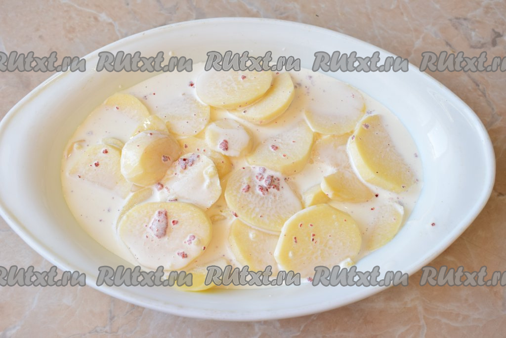 Сливки можно использовать любой жирности. Чем выше их жирность, тем насыщеннее будет сливочный вкус готового блюда. В сливки добавьте соль и специи, перемешайте. В форму для запекания выложите половину нарезанного картофеля. Полейте картофель половиной сливок.