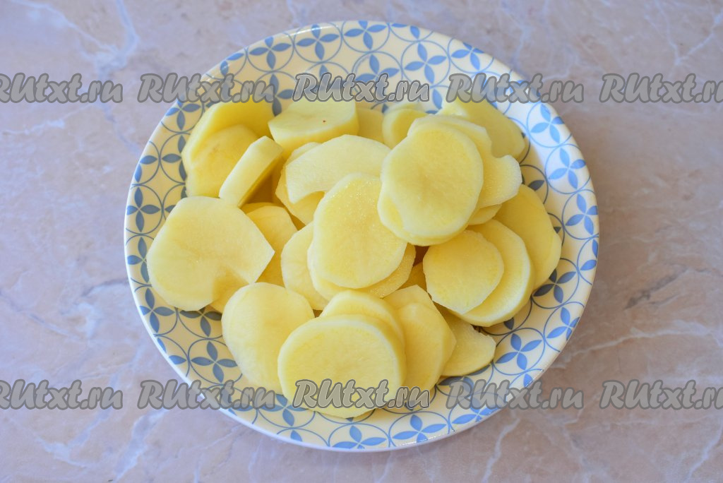 Очищенные картошины ополосните водой и нарежьте на кружочки средней толщины (совсем тонко нарезать картошку не нужно, но и толстыми ломтики картошки не должны быть).