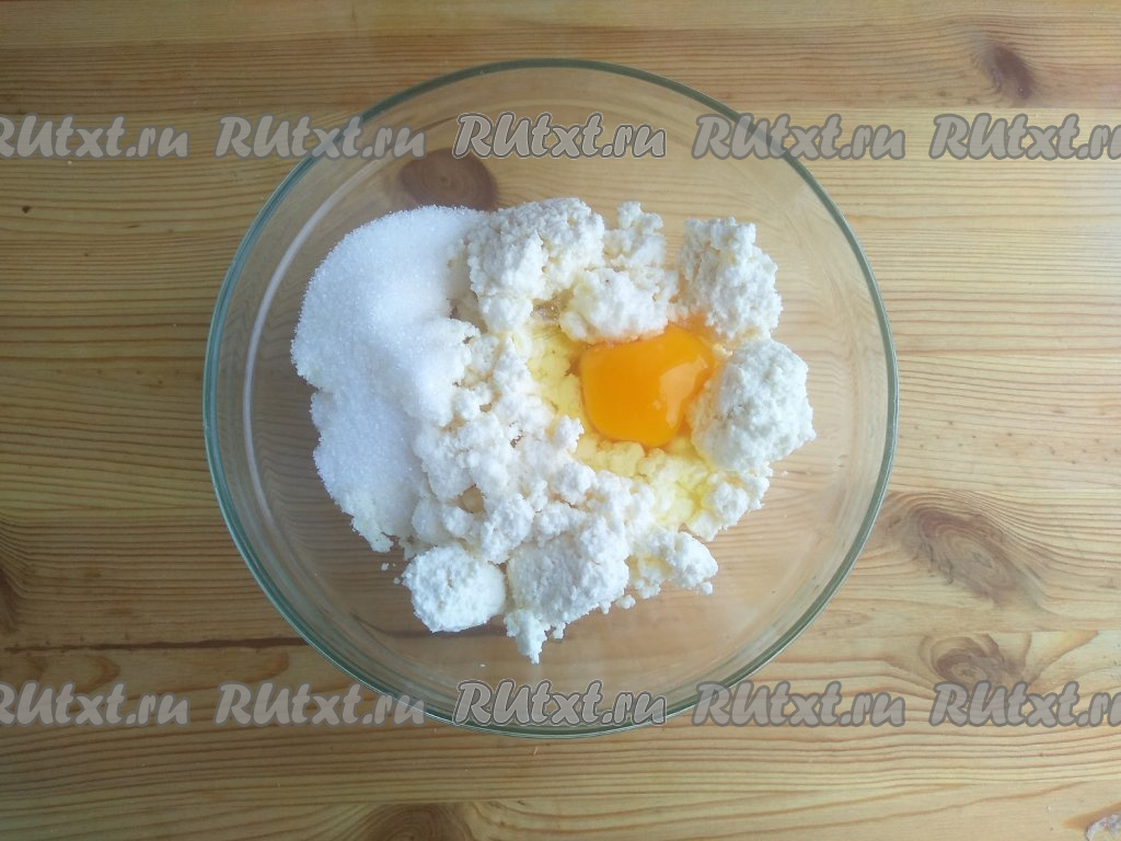 В миску выложить творог, сахар, соль, ванилин и яйцо.