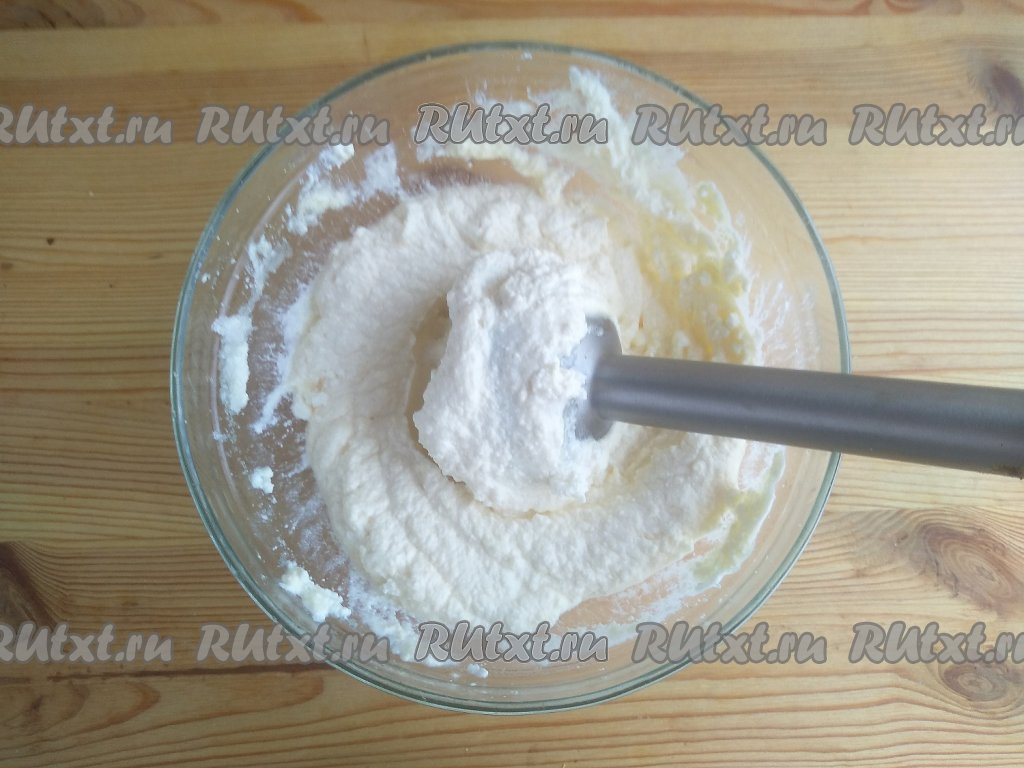 Выложить изюм в творожную массу, перемешать лопаткой, равномерно распределяя изюм.