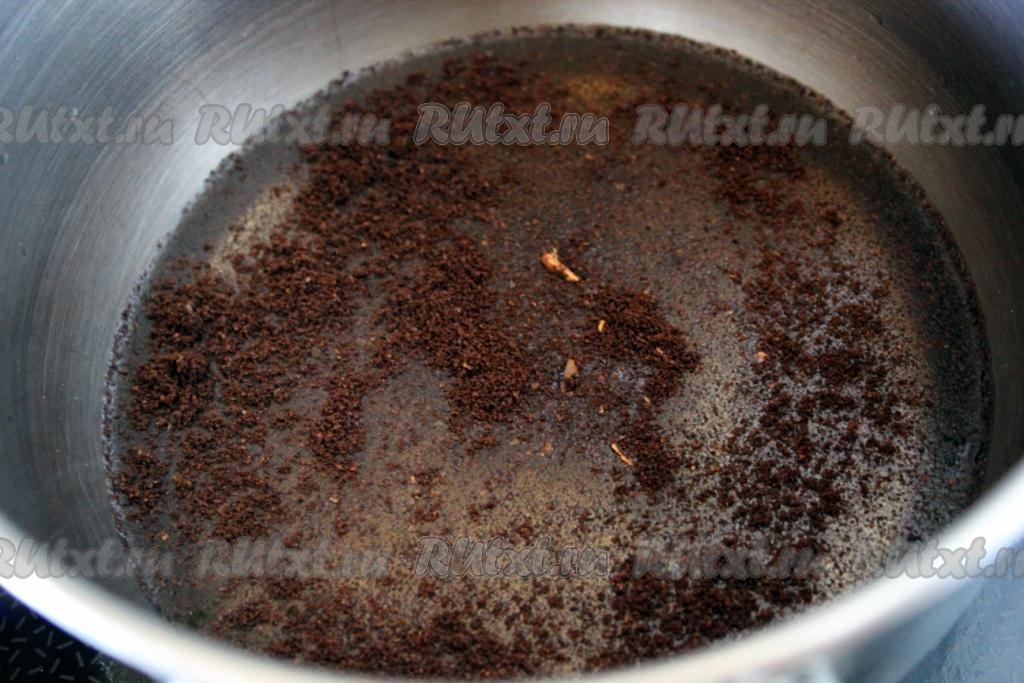 Сварите кофе: налейте холодную воду, положите молотый кофе и кусочек палочки корицы, доведите до кипения и снимите с огня, добавьте сахар.