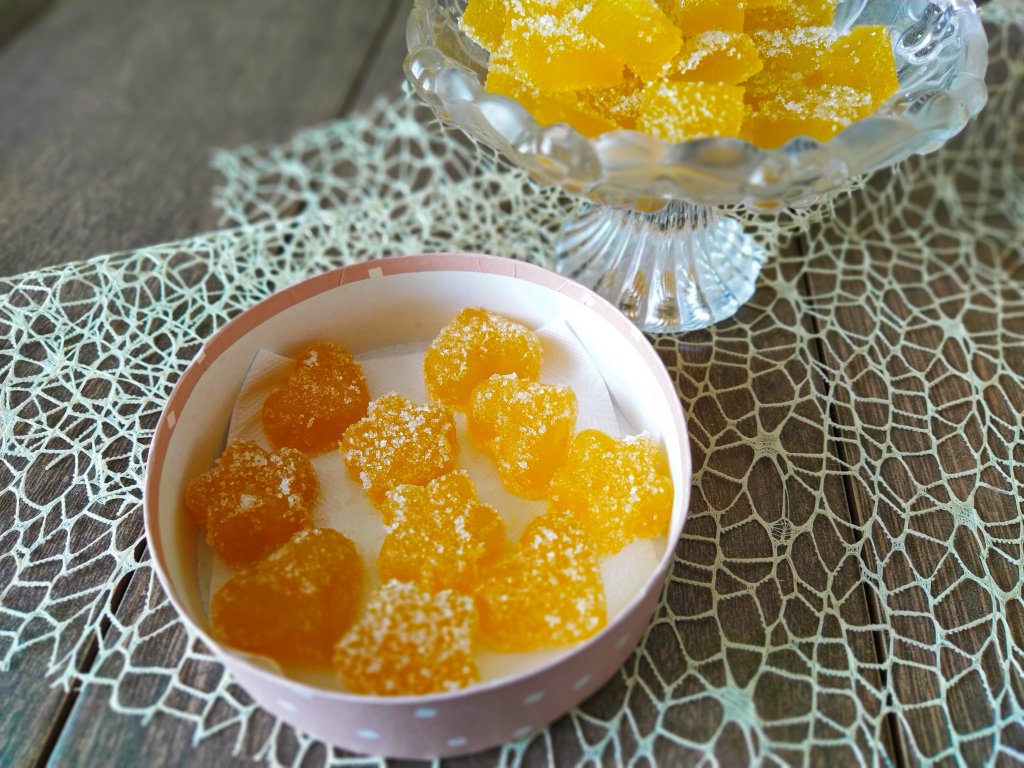 Апельсиновый мармелад, приготовленный с добавлением агар-агара перед подачей, при необходимости, можно посыпать сахаром и переложить в тарелку. Как видите, всё очень просто и быстро. Угощайте себя и свою семью этим ярким и очень вкусным лакомством!