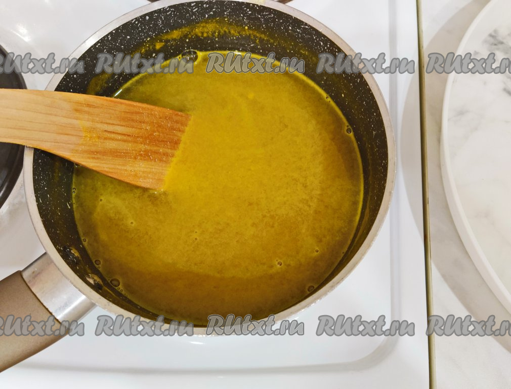 Из четырех апельсинов у меня получилось 340 миллилитров сока. Сок разделить на две равные части. Одну часть перелить в сотейник, всыпать 150 грамм сахара и перемешать. В другую часть сока насыпать агар-агар, перемешать и оставить на 10 минут.