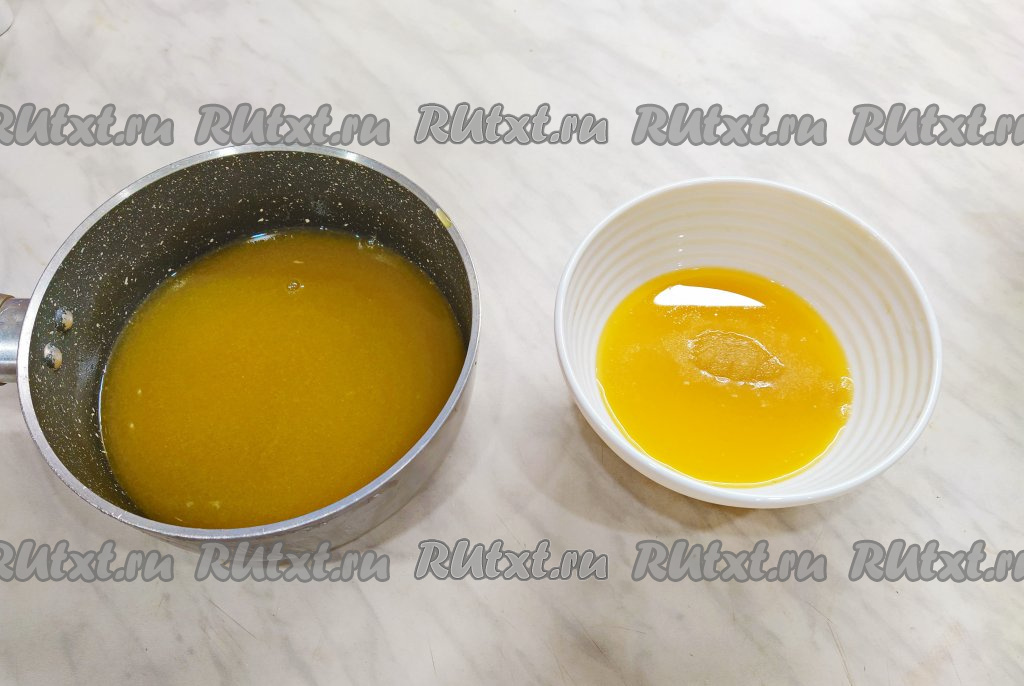 Сотейник с апельсиновым соком и сахаром поставить на огонь, довести до кипения, уменьшить огонь и, постоянно помешивая, проварить сироп 1-2 минуты (до полного растворения сахара). Затем в кипящий сироп, не переставая помешивать, влить сок, смешанный с агар-агаром, довести до кипения, а затем варить на небольшом огне 3 минуты.