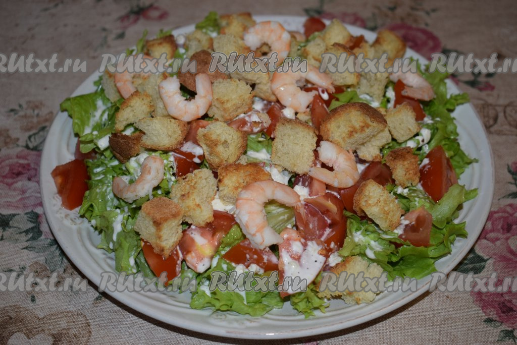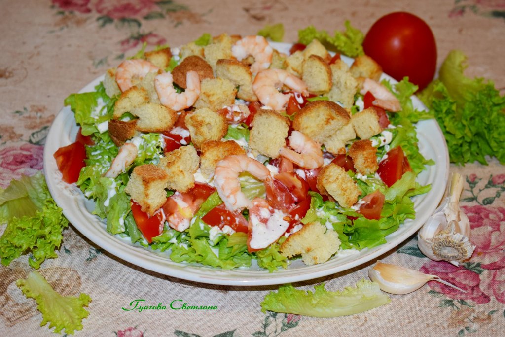 Листья салата и помидоры заливаем заправкой, сверху выкладываем сухарики и креветки. Наш постный салат "Цезарь" с креветками готов. Подаём его сразу к столу, а перемешиваем уже во время еды.