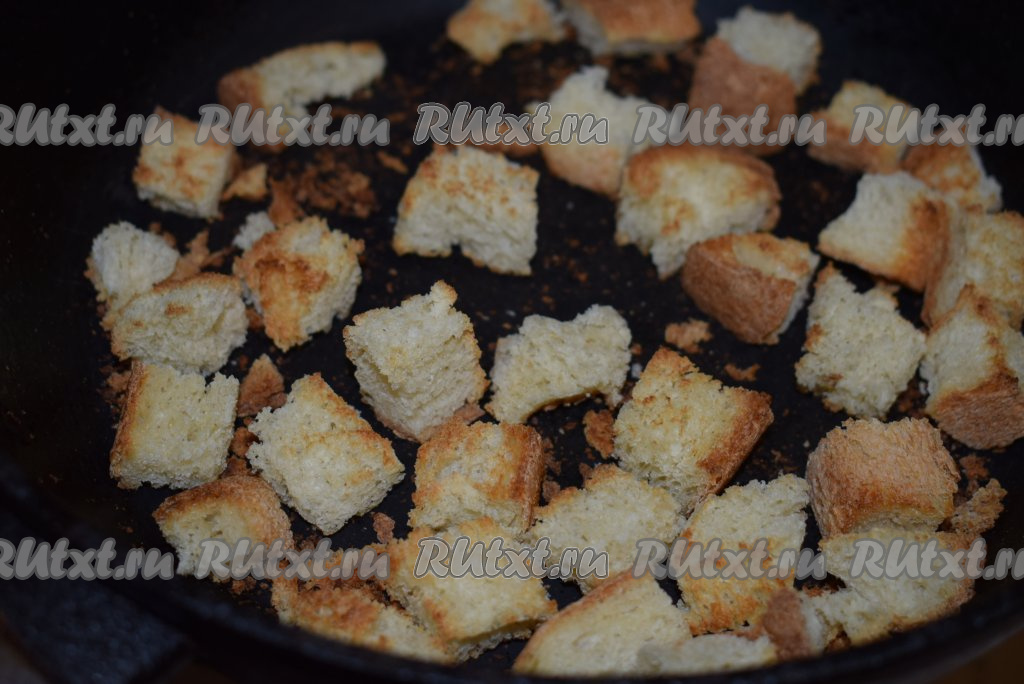 Сковороду разогреть (смазывать сковородку маслом не нужно), выложить хлебные кубики, жарить сухарики на сухой сковороде, периодически помешивая, примерно, 8-10 минут, огонь должен быть умеренным, чтобы сухарики успели подсушиться и не пригорели. Готовые сухарики убрать с огня, дать им остыть.
