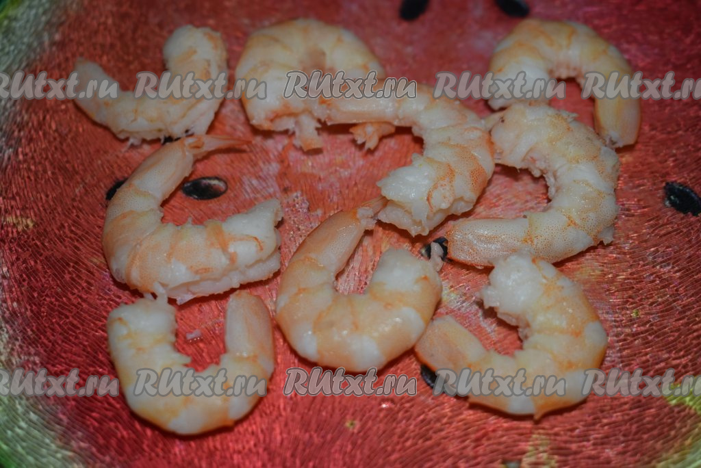 Остывшие креветки очистить от голов и панциря.