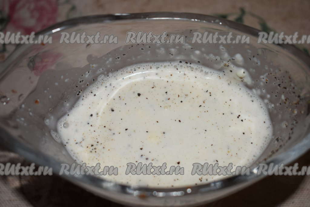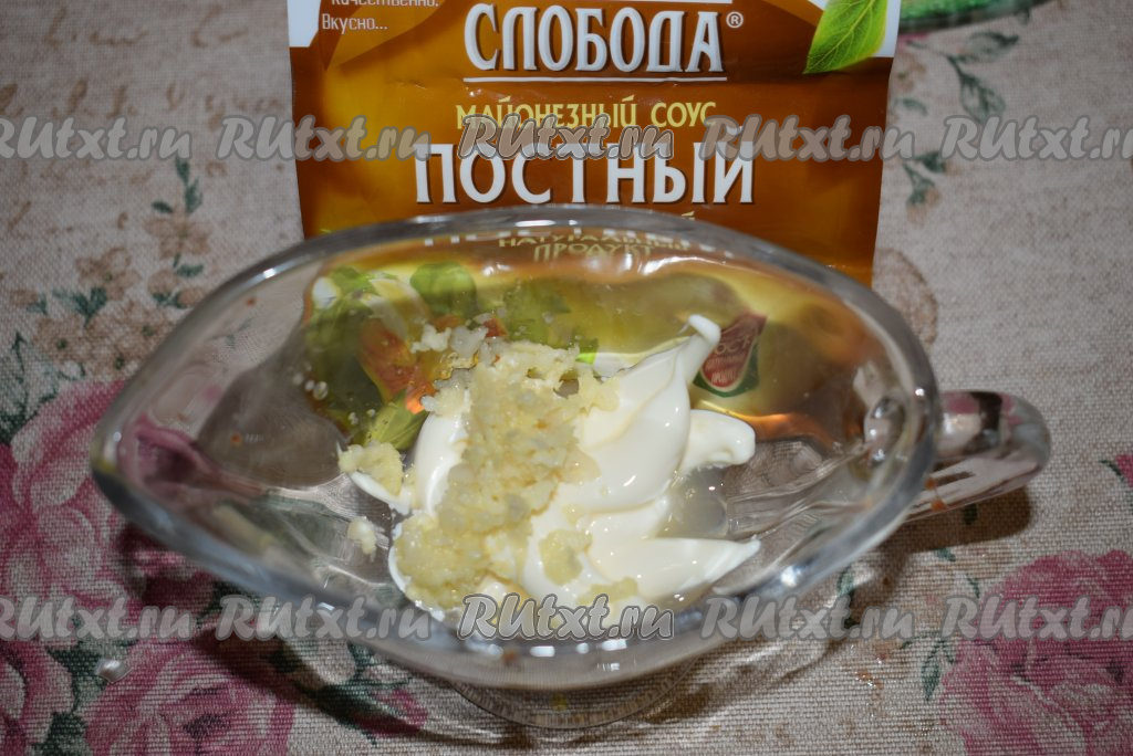 Далее для приготовления заправки для постного салата "Цезарь", нужно в соусник выложить постный майонез, пропущенный через пресс чеснок, добавить сок лимона, соль и чёрный молотый перец, тщательно перемешать.