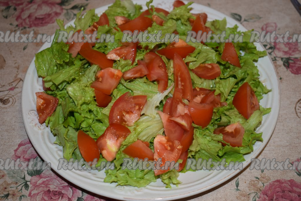 Помидоры нарезать на дольки и выложить поверх листьев салата, слегка присолить овощи.