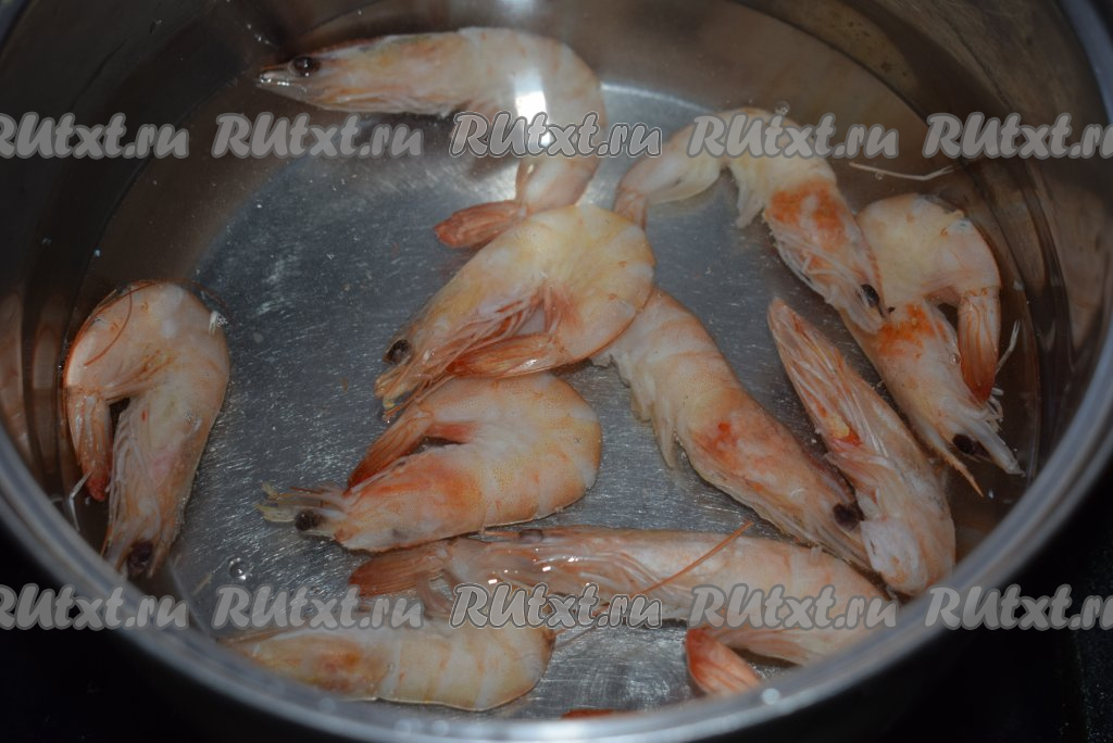 Креветки положить в кастрюлю с кипящей подсоленной водой и отварить с момента закипания в течение 3-4 минут. Воду с креветок слить и дать им остыть.