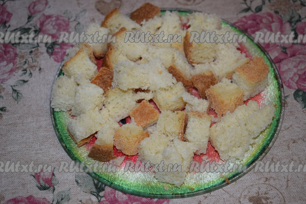 Белый хлеб (или батон) нарезать на кубики.
