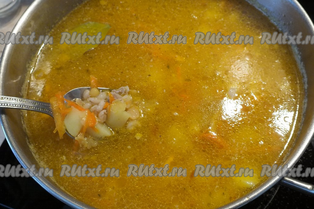 Затем выложите в суп варёные горох и перловку, доведите до кипения, а после этого варите на минимальном огне минут 15-20. За 5 минут до готовности добавьте лавровый лист.