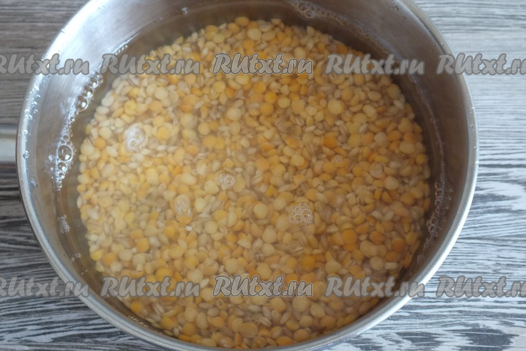 В кастрюлю выложите промытые горох и перловку, залейте 600 мл воды и поставьте на огонь, после закипания воды варите до мягкости круп (примерно, часа 1,5).